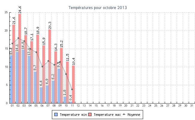 | 10 | 1.8 °C | 11.5 °C | 8.0 °C | 4.5 km/h (28.4 km/h) | NNE |