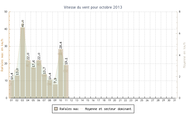 | min | max | moy | Vitesse (rafales) | Secteur | ||
